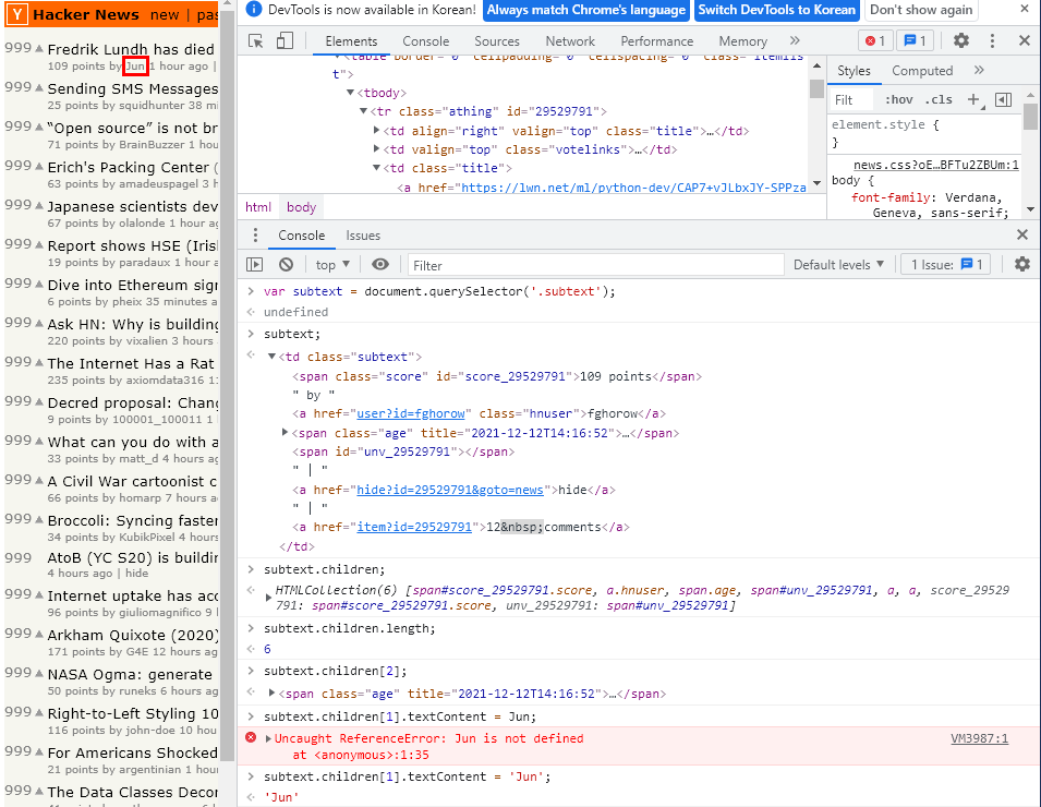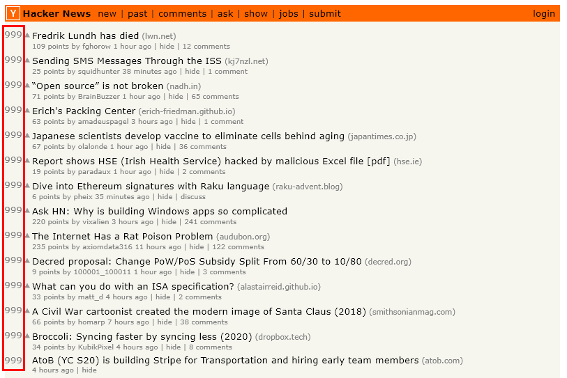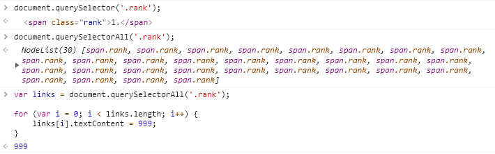 위처럼 for문을 이용해서 rank의 text를 모두 999로 바꾸어보았다. 그러면 해당 사이트에 뜨는 rank들은 다음과 같이 바뀐다.