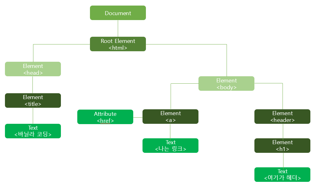 DOM이라고 하면 실제로 화면에 표현된 것들, HTML은 이 DOM을 설계하기 위한 MarkUp 언어 혹은 설계도라고 보면 된다. 이 HTML 문서를 통해 화면에 보여지는 것이 DOM이다. 그리고 이 DOM은 트리구조로 이루어져 있다.