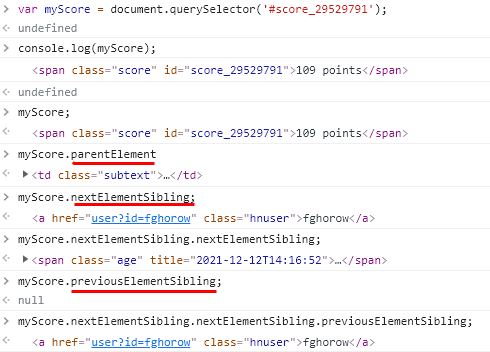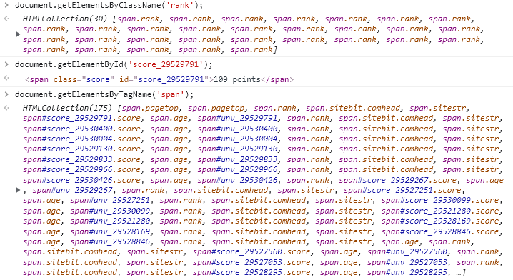 이들은 .이나 #이 붙지 않는다. 그럴 필요가 없으니까. getElementsByClassName의 class가 rank인 것들 모두, getElementsByTagName은 tag가 span인 것들 모두 가져와 배열 형태로 돌려준다. id의 경우는 용도에 걸맞게 1개만 출력시킨다.