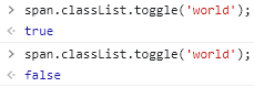 - toggle : class에 원하는 class name이 없다면 추가하고, 원하는 class name이 이미 존재한다면 제거한다. 그리고 전자의 경우에는 true를 출력하고, 후자의 경우에는 false를 출력한다.