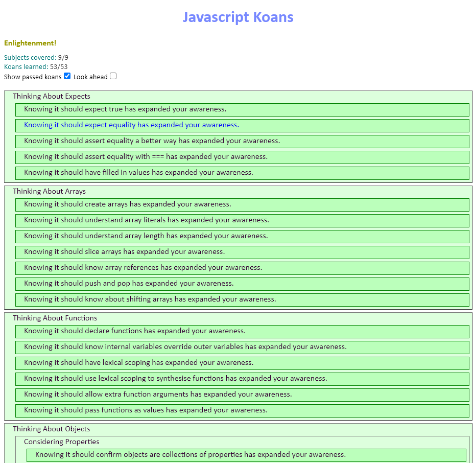 위에 enlightenment라는 단어가 있는데 깨우침, 이해, ... 혹은 계몽?이라는 뜻이라고 한다. 다 맞췄다고 해서 깨우쳤다고 할 수 없을 것 같고, 응용할 수 있을 때 비로소 깨우쳤다고 말할 수 있을 것 같다. 헤헷