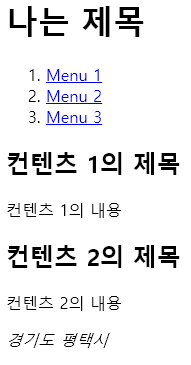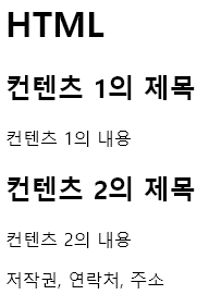 | footer | 가장 밑 부분으로 주소, 연락처, 저작권 등의 내용이 위치한다. |