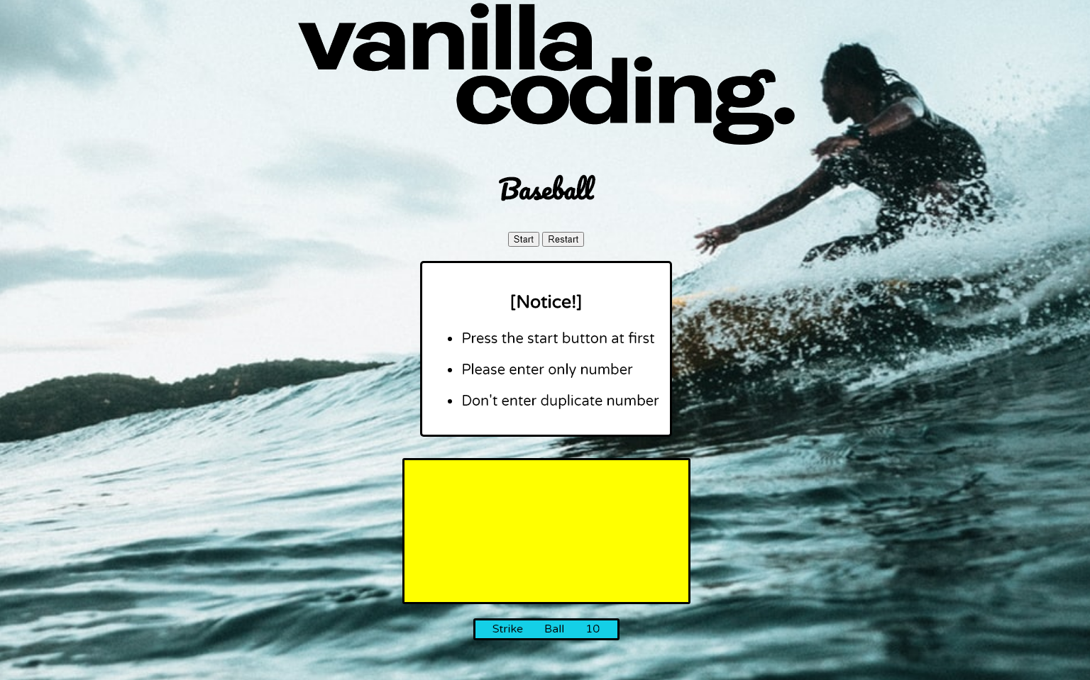 -> 위 설계는 여러번 start를 누른다고 계속해서 랜덤한 3자리 숫자가 나타나지 않는다... 그리고 start를 누르지 않았는데 input에 입력하면 10번의 chance가 입력할 때마다 감소한다. 이것들은 단순하게 때에 따라 display를 none하는 것을 이용했다.